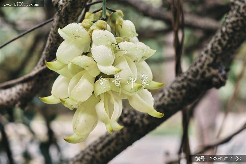 禾雀花序悬挂于悠长盘曲的老茎上,吊挂成串,每串二、三十朵,串串下垂。酷似无数白中带翠,如玉温润的小鸟栖息在枝头。